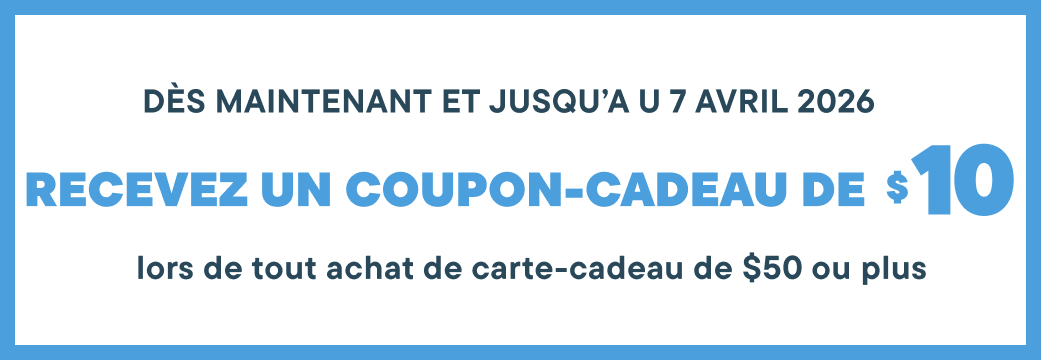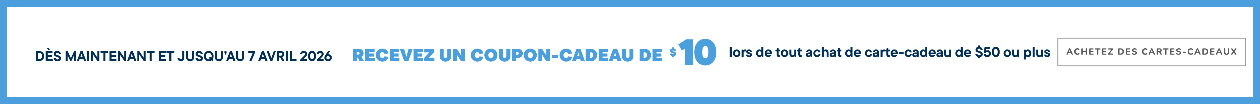 carte-cadeau de 50 $ ou plus. Le client recevra un bon d'achat de 10 $ à utiliser lors d'un prochain achat de 40