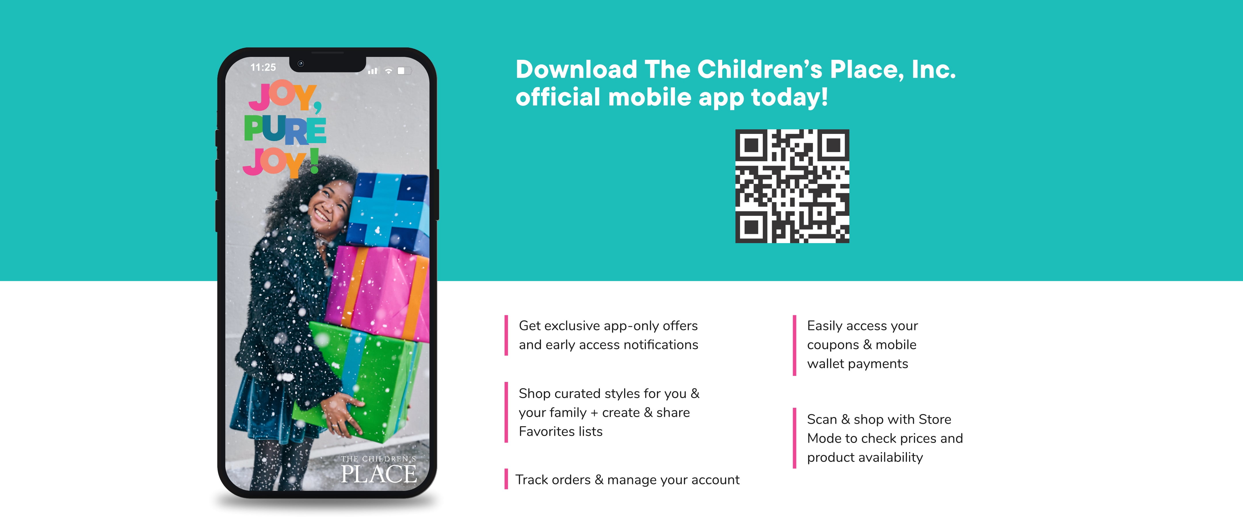 10 % DE RÉDUCTION SUR LES ACHATS INTÉGRÉS AVEC LE CODE APP10. Valable du 2 juillet 2025 au 12 août 2025. Valable uniquement sur les achats effectués dans l'application mobile officielle The Children's Place, Inc. pour les livraisons au Canada seulement. Non valable en magasin, en ligne sur childrensplace.com, Gymboree, ni sur les commandes expédiées à l'extérieur du Canada. Valable uniquement sur les articles de marque The Children's Place ; exclut les articles de marque Gymboree . La réduction s'applique après les autres réductions applicables, et avant l'application des taxes et des frais de livraison. Pour les achats en ligne, le total de la commande après l'application du coupon et de toutes les autres réductions applicables doit être d'au moins 0,01 $ ou plus pour que la commande en ligne soit complétée. Les coupons de réduction en dollars seront appliqués sous forme de pourcentage de réduction sur chaque article admissible de votre transaction, mais apparaîtront comme un montant en dollars appliqué. Valable pour les achats multiples. Limite d'un coupon par transaction. Ne peut être combiné à d'autres offres. Non valable en conjonction avec la réduction associée The Children's Place . Non valable pour l'achat de cartes-cadeaux, d'articles déjà achetés, les paiements par carte de crédit, les Liquidation ou les articles de tiers, comarqués ou sous licence. Non utilisable dans un magasin en cours de fermeture, dans le cadre d'une promotion en magasin ou en ligne, ni pour les achats en gros. Les coupons ne sont pas échangeables contre de l'argent comptant ni un avoir sur les articles et n'ont aucune valeur monétaire. Les retours et les échanges sont soumis à la réduction appliquée au moment de l'utilisation. Ne peut être acheté, reproduit, échangé ou vendu. Seuls les coupons originaux sont acceptés. Un code promo valide doit être fourni au moment du paiement. L'offre ne sera pas renouvelée en cas de perte, de vol, de corruption ou de destruction, ni en cas de retour/remboursement de la marchandise. Distribution sur Internet strictement interdite. L'utilisation du coupon vaut acceptation de ses conditions. L'offre peut être annulée ou modifiée par The Children's Place, Inc. à tout moment. Nul là où la loi l'interdit.