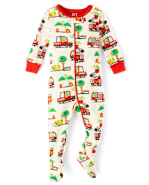 Pyjama une pièce ajusté en coton avec pieds pour bébé et tout-petit garçon, motif camion de pompiers - white